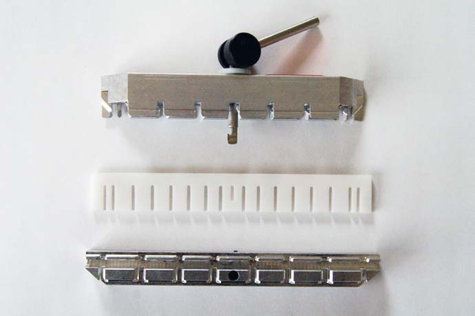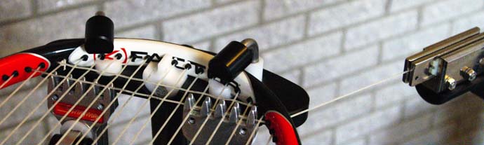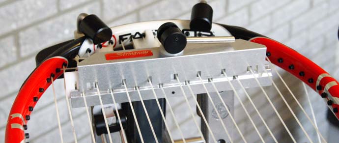 Eerste breedtesnaar: beginnen We hebben na het spannen van de lengtesnaren een knoop linksboven op het racketblad gemaakt voor de lengtesnaren. Rechtsboven op het racketblad zit de laatste lengtesnaar in een klem en steekt naar buiten. We gaan met deze snaar verder. Het heeft de voorkeur om de breedtesnaren van boven naar beneden te spannen (dit is bij sommige rackets niet mogelijk als je één snaar gebruikt in plaats van een aparte lengte- en breedtesnaar). Dit houdt verband met de krachten die op het blad komen te staan. In het voorbeeld komen we met de lengtesnaren aan de bovenkant uit, en kunnen we dus boven verder. Kom je niet aan de bovenkant uit, dan moet je de snaar afknopen, afknippen en met de breedtesnaren verdergaan. Hoe je uitkomt met de lengtesnaren is afhankelijk van het aantal lengtesnaren. ![]() Voer de snaar door de tule voor de bovenste breedtesnaar. Zoals je in de foto kunt zien, is er ook hier weer een geleidelipje. Gebruik dit geleidelipje om te voorkomen dat je de tule links naast het geleidelipje blokkeert. Blokkeer je deze tule toch, dan kom je in problemen bij het spannen van de tweede breedtesnaar. Eerste breedtesnaar: weven Breedtesnaren doorvoeren is veel lastiger dan lengtesnaren doorvoeren. Dit komt omdat ze gewoven moeten worden. Het doorvoeren is dan lastiger omdat er meer weerstand bij het doortrekken van de snaar ontstaat. Trek de snaar voorzichtig door, anders kan de snaar beschadigd raken. ![]() Het weven houdt in het voorbeeld in: onder de eerste lengtesnaar door, over de tweede heen, onder de derde door enzovoort. Merk op dat als je begint met de eerste er onder door, dat de laatste er dan altijd overheen gaat. Dit geeft een eerste controle op weeffouten. Ga met het oog echter nog even langs het resultaat. ![]() Merk op dat het naar buiten voeren van de eerste breedtesnaar zonder problemen gaat omdat we eerder de lengtesnaren over de geleidelipjes hebben gelegd. Is dit echter niet goed genoeg gebeurd, dan zit het gat geblokkeerd. Je moet dan heel voorzichtig met een hulpmiddel, bijvoorbeeld een schroevendraaier met een groot vlak, de lengtesnaar wat opzij duwen. Wees heel voorzichtig en wordt vooral niet boos. Veel snaren overleven dit niet. Spannen eerste breedtesnaar Stel eerst de spankracht in voor de breedtesnaren. In de foto is FW is de spankracht voor de breedtesnaren (FL staat nog op 12,8 voor de knoop van de lengtesnaar). De gebruikte machine werkt met de bij FW aangegeven spankracht als het sterretje achter de waarde van FW staat. ![]() Span vervolgens de eerste breedtesnaar. ![]() Geef de snaar (en ook alle volgende) 12 seconden om de 'permanente' rek (dat is rek die na uitrekken niet meer terugveert) kwijt te raken en voel voorzichtig met de hand of de wrijving wel geheel overwonnen is. Soms zul je de machine nog even verder voelen spannen wanneer je dit doet. ![]() Zet vervolgens de klem. Je kunt nu goed zien waarom de klem 'tanden' heeft. Hierdoor kan de klem tussen de lengtesnaren doorkomen om de breedtesnaar vast te zetten. Houd, net als bij de lengtesnaren, ook bij de breedtesnaren de klem voor het aanspannen wat scheef naar de richting van waar de snaar vandaan komt. Hierdoor is er minder speling bij het vastzetten van de klem en is er minder spanningsverlies. Spannen tweede breedtesnaar Voer de snaar door de tule voor de tweede breedtesnaar. ![]() Het doorvoeren lukt omdat we bij het spannen van de lengtesnaren de geleidelipjes gebruikt hebben (ook bij het afknopen). ![]() Weef de snaar naar de andere kant. Waar de snaar bij de eerste breedtesnaar over lengtesnaren is gegaan, moet hij er nu juist onderdoor, en vise versa. Voer de snaar naar buiten. Ook nu moet dit goed gaan omdat we bij het spannen van de lengtesnaren er voor gezorgd hebben dat het gat niet geblokkeerd is. Is dit per ongeluk wel het geval dan moeten we de snaar voorzichtig wat opzij houden om de breedtesnaar door te kunnen voeren. ![]() Span tenslotte de breedtesnaar en zet de klem. Dwarstool bevestigen Voor de derde en op twee of drie na volgende breedtesnaren gebruiken we in dit voorbeeld het dwarstool. In plaats van het gebruiken van het dwarstool, kun je uiteraard ook gewoon verder gaan, en met de hand weven. Dat is meer werk maar gaat net zo goed, behalve in het geval van de hier gebruikte natuurlijke darmsnaar. Het dwarstool maakt het mogelijk om deze kwetsbare snaren te spannen. Het voorkomt wrijving bij het doorvoeren en bij het spannen. De onderdelen van het dwarstool zijn: ![]() We plaatsen het nylon middenstuk tussen de lengtesnaren. Let goed op dat dit symmetrisch gebeurt. Links en rechts moeten evenveel snaren overblijven. ![]() Bevestig vervolgens de onder- en bovenkant van het dwarstool. De eerste keer zal je dit heel lastig vinden. De trekstaaf moet tussen de middelste twee lengtesnaren door, in de onderkant van het dwarstool gestoken worden. Kijk vooraf goed hoe de trekstaaf langs de dwarspin in de onderkant kan, een kijk ook heel goed hoe de trekstaaf moet draaien om vast te haken aan de onderkant. Eenmaal vast, dan hoeft de trekstaaf niet meer los. ![]() Het enige wat nog hoeft, is de trekstaaf al dan niet aanspannen. Pas op dat je daarbij de handel niet ronddraait. De handel kan de hele tijd in dezelfde richting blijven staan (op de foto's lijkt dit niet het geval, maar het enige verschil is dat de handel aangespannen staat of niet). ![]() Het dwarstool kan naar links of naar rechts verzet worden. Hiermee kun je bepalen welke lengtesnaren omhoog of omlaag geduwd worden. Voor het omhoog en omlaag duwen, klem je met de handel het dwarstool aan. De snaren worden dan om en om omhoog of omlaag gedrukt. Voor het weven moet bij iedere volgende breedtesnaar het dwarstool verzet worden. Je moet immers wisselen van onderdoor naar bovenlangs doorvoeren, en omgekeerd. Op de foto staat het dwarstool naar links. Je kunt dit goed zien aan het uitsteken van het nylon deel aan de rechterkant. ![]() Of het dwarstool naar links of naar rechts moet, is afhankelijk